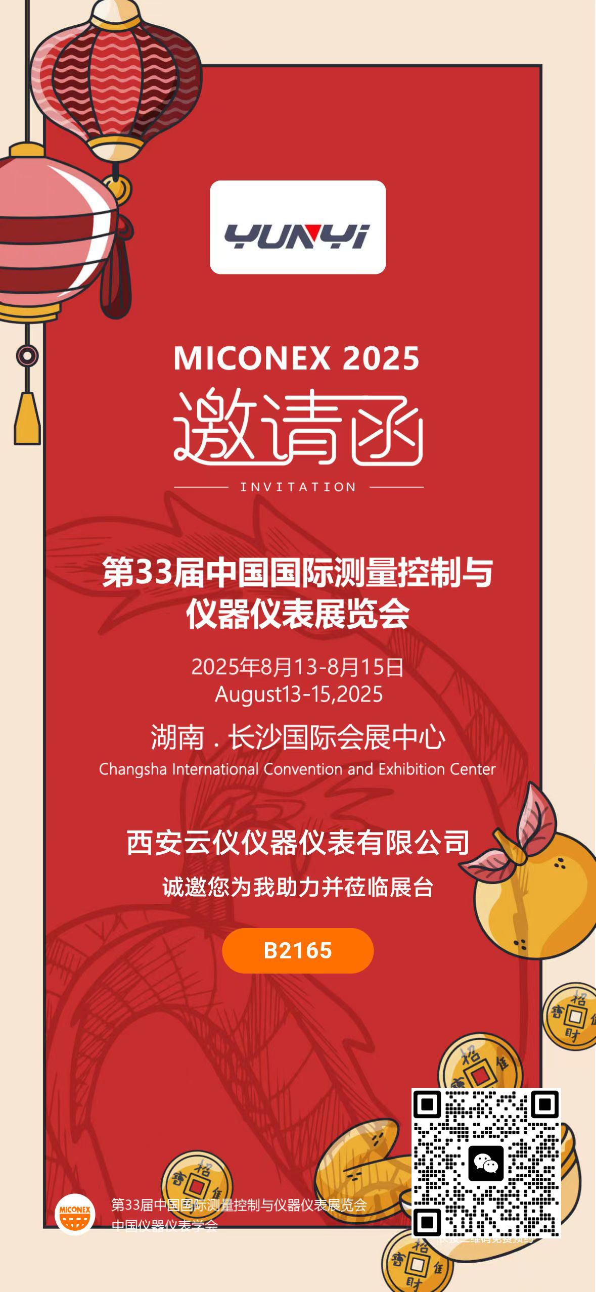 激清函 invitation 第33届中国国际测量控制与仪器仪表展览会 2025年8月13-8月15日 湖南,长沙国际会展中心 西安云仪仪器仪表有限公司 诚邀您为我助力并莅临展台 b1265