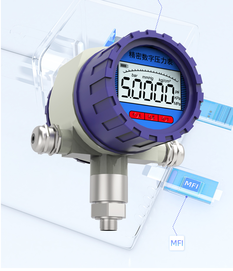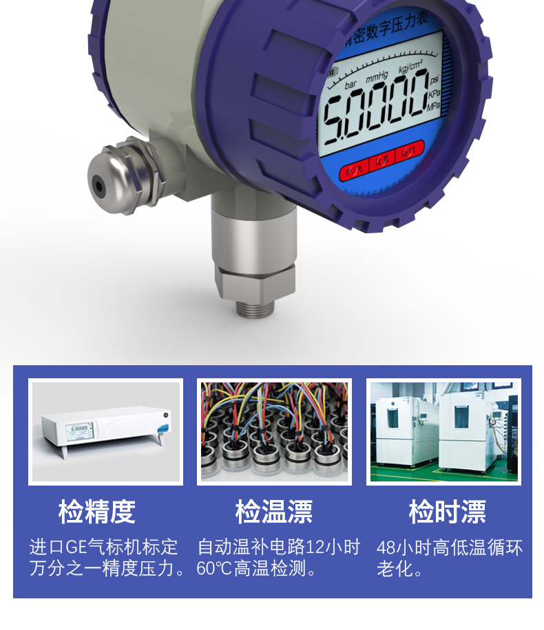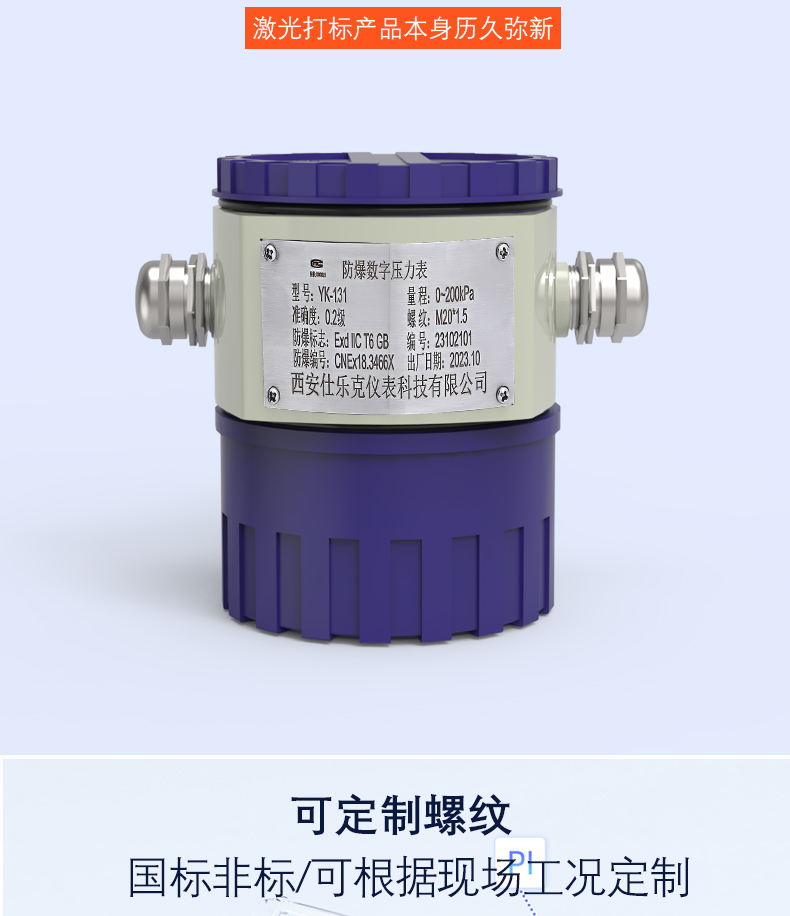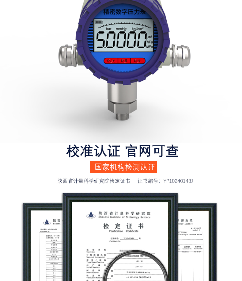yk-1防爆数字压力表采用进口传感器,性能优越,具有精度高、抗腐蚀、抗冲击、抗震动、高稳定性等优点;信号处理电路采用最新超低功耗处理器、信号处理芯片及电源管理芯片组成,采用大容量高性能锂电池供电,无需外电源供电。采用5位数字显示和模拟百分比显示,读数直观方便,该产品精度可达到0.05级,适用于普压表、精密压力表和压力变送器的校验与检定,更能代替传统机械式指针压力表进行现场测量压力。