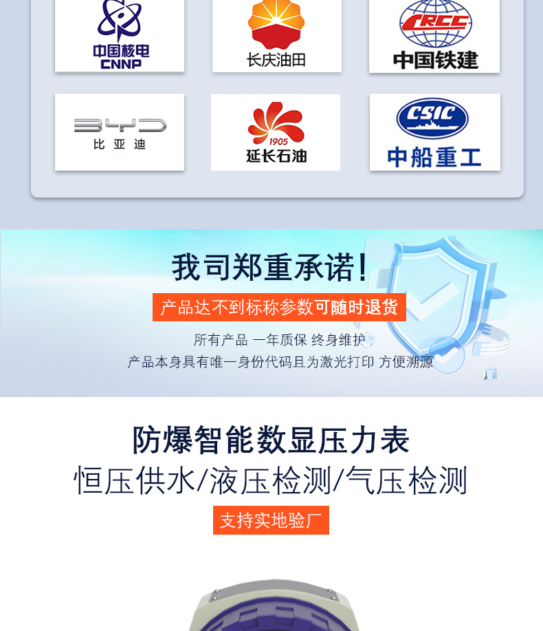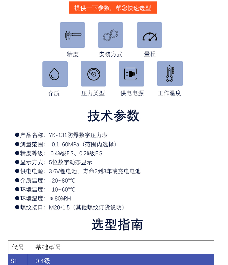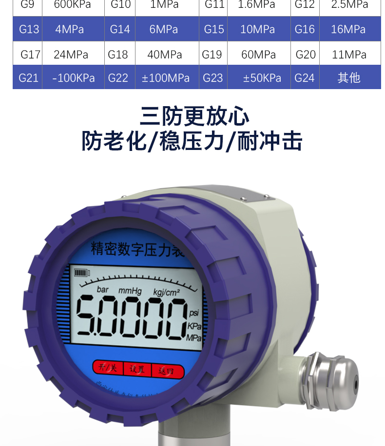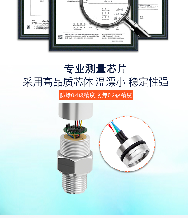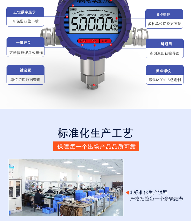 yk-1防爆数字压力表采用进口传感器,性能优越,具有精度高、抗腐蚀、抗冲击、抗震动、高稳定性等优点;信号处理电路采用最新超低功耗处理器、信号处理芯片及电源管理芯片组成,采用大容量高性能锂电池供电,无需外电源供电。采用5位数字显示和模拟百分比显示,读数直观方便,该产品精度可达到0.05级,适用于普压表、精密压力表和压力变送器的校验与检定,更能代替传统机械式指针压力表进行现场测量压力。